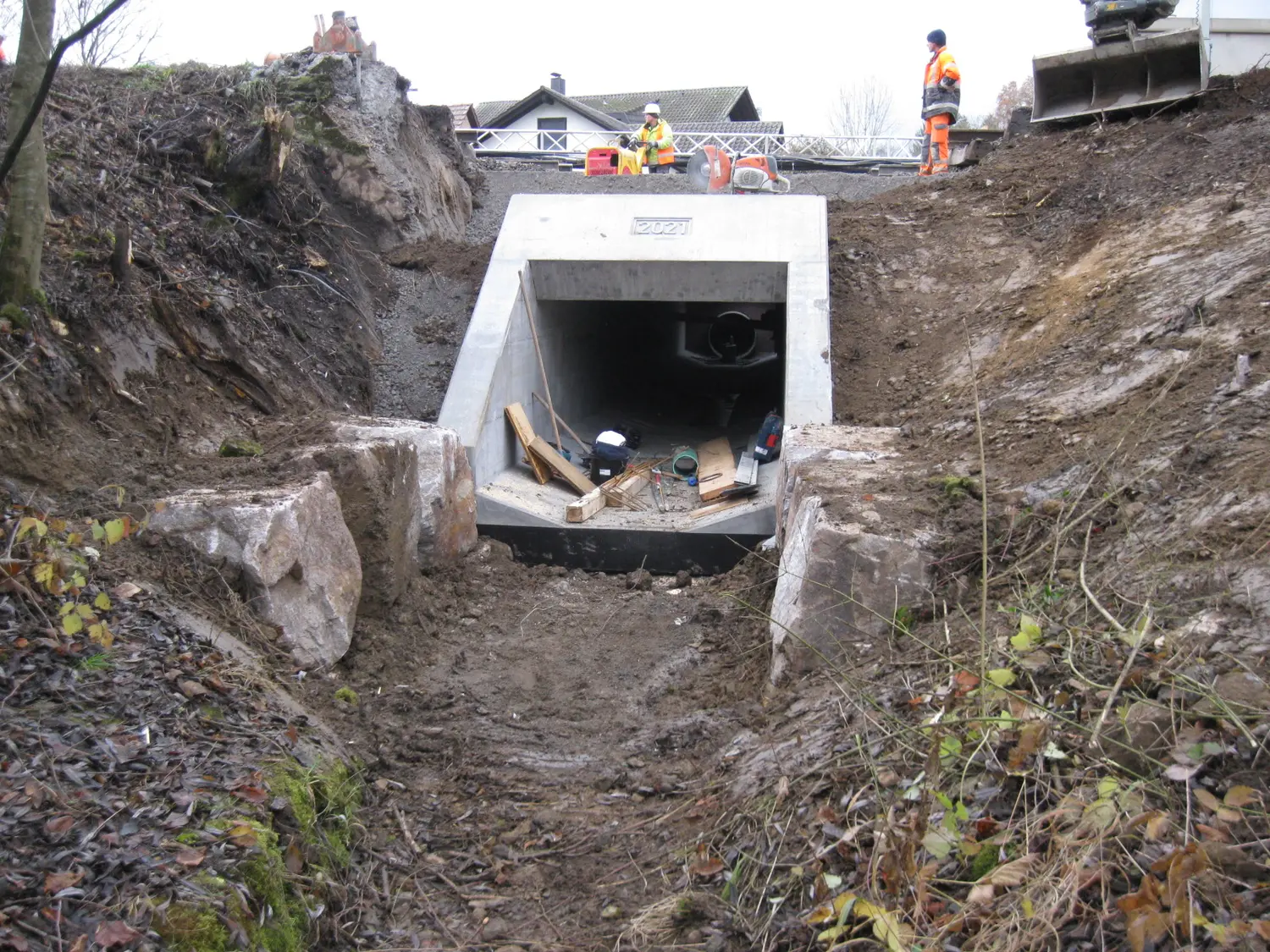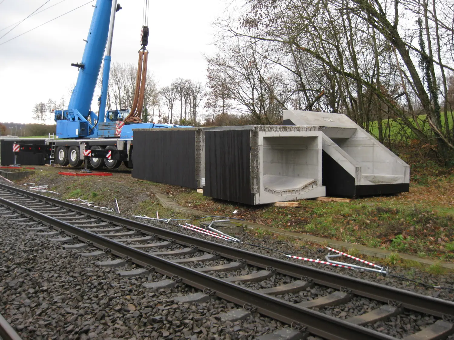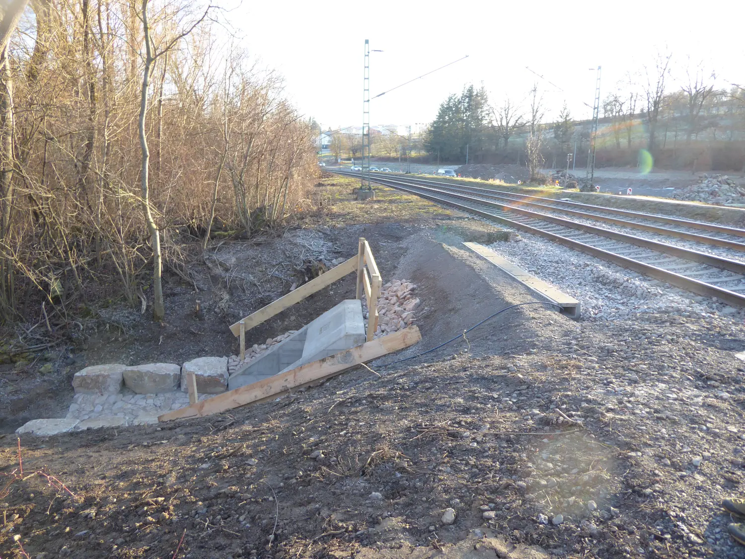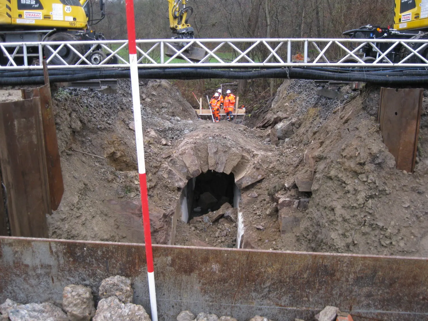 Erneuerung eines Durchlasses mittels Stahlbetonrahmen, aus vorgefertigten Fertigteilen. Abbruch des bestehenden Bauwerks und Einbau des neuen Bauwerks während einer Totalsperrung der Strecke