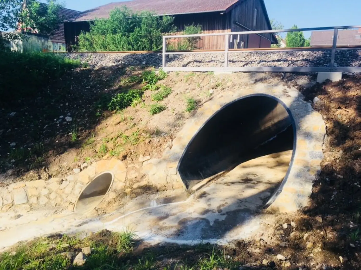 Während einer Streckensperrung wurde das bestehende Brückenbauwerk teilweise abgebrochen. Das Stahlrohr wurde mittels Schienenkran in einem Stück eingehoben und auf der bereits vorbereiteten Gründungsebene kraftschlüssig aufgelagert.