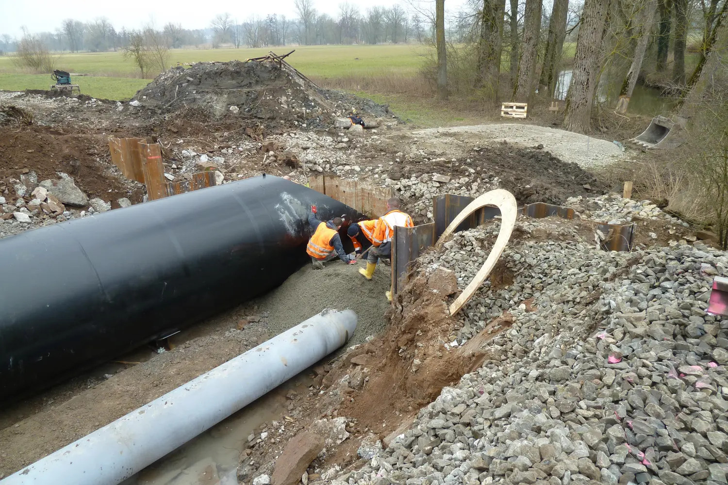 Bereits im Vorfeld wurden mit wasserdichten Umspundungen die erforderlichen Gründungselemente unterhalb des anstehenden Wasserspiegels vorbereitet.
