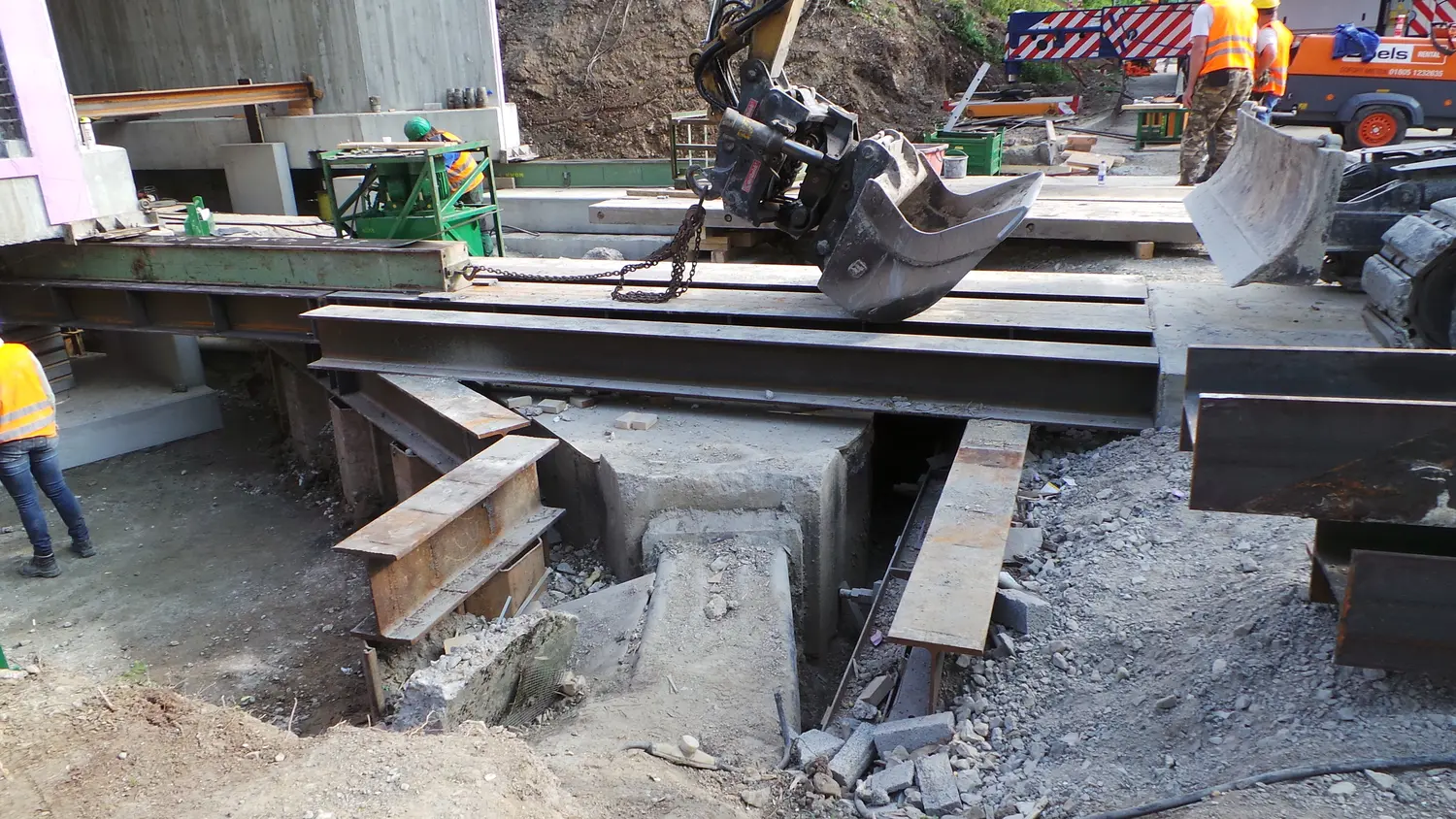 Der Einschub erfolgte während einer Vollsperrung von 77h. In der Nacht von Freitag, 22. Mai 2015 auf den 23. wurden die Schienen aufgetrennt, die Gleisjoche ausgehoben und die Weiche ausgebaut. Der Abbruch der alten EÜ dauerte den ganzen Samstag, die Bestandsfundamente waren härter als gedacht. Anschließend wurden der Untergrund und die Verschubbahn vorbereitet.
