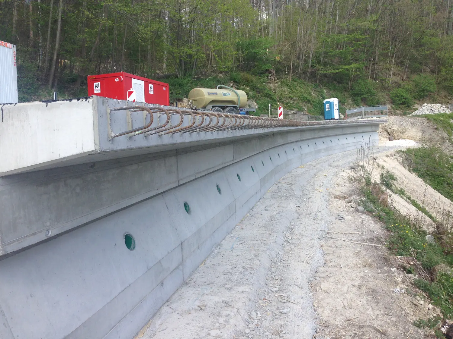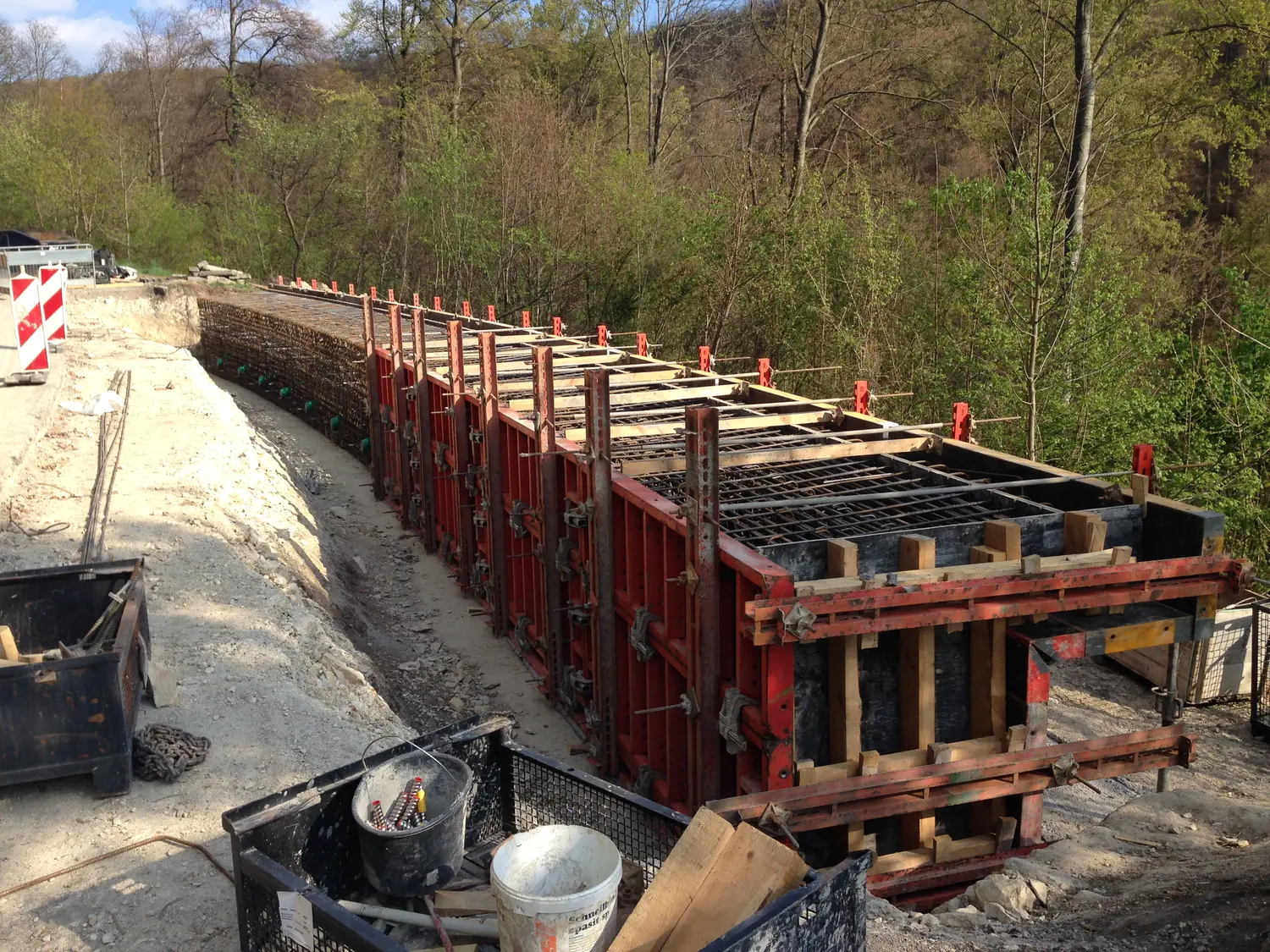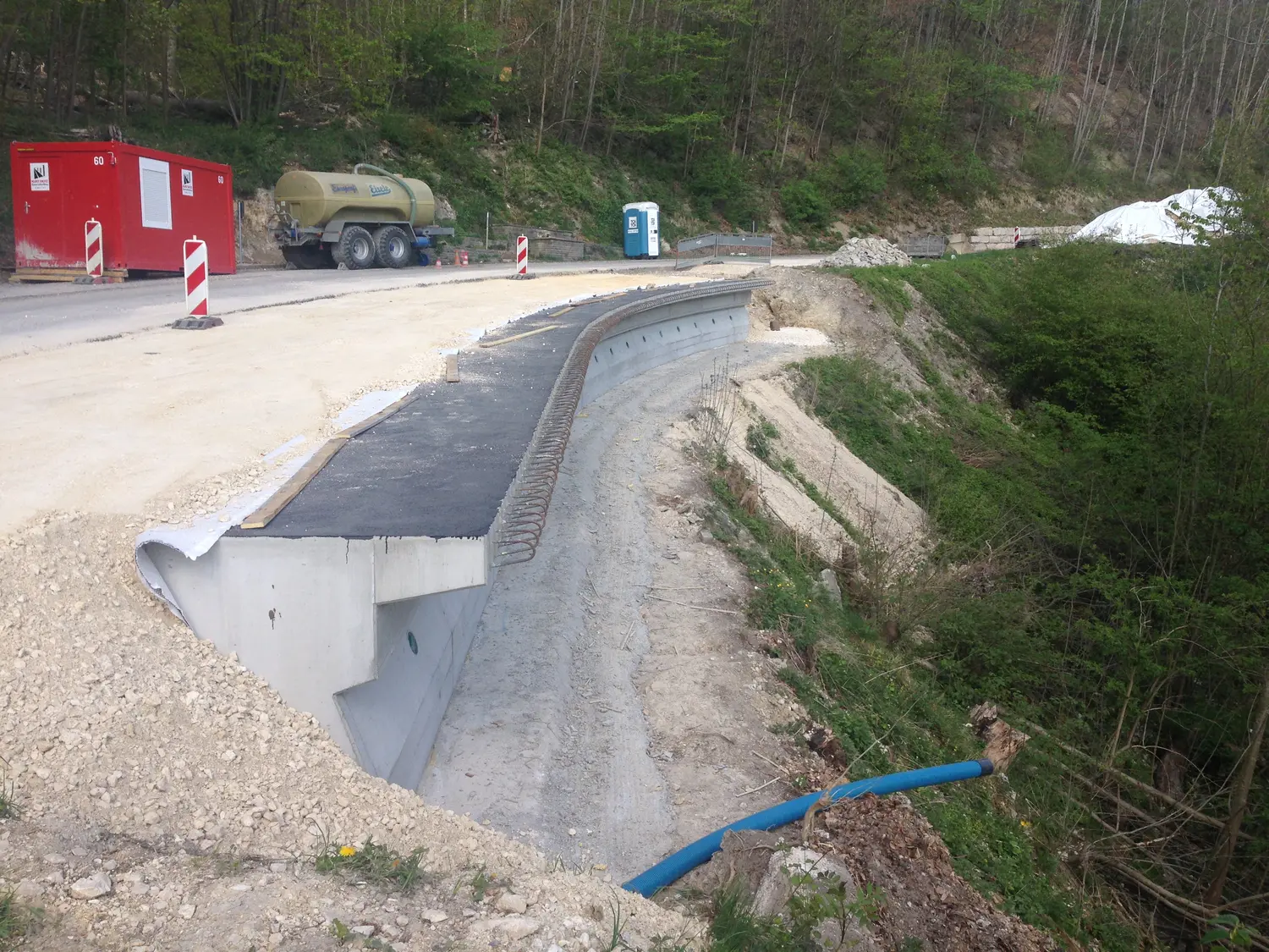 Zur Sanierung der Rutschungen wurden talseitig drei aufgelöste, rückverankerte, Bohrpfahlwände auf einer Länge von BA1 = 32,00m; BA2 = 32,00m und BA3 = 26,00m erstellt. Zur Sicherung der Fahrbahn wurden die Bohrpfähle mit einem Kopfbalken verbunden.